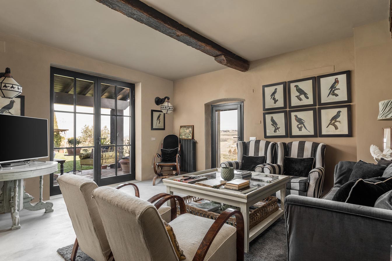 Casa Toscana is a large farmhouse that is called a Leopoldino, which is a type of construction typical of the mid to late 1700’s usually characterized by a square structure on the top which is called the colombaia. The colombaia was used to raise doves or pigeons by the occupying family for consumption. Today, although the access holes for the doves remain, it now serves as our home cinema/family room. It is an amazing space that features a beautiful system of joined wooden beams. Below, we have 4 luxury bedrooms with five bathrooms, full kitchen, dining room, living room, a lovely garden with an outdoor kitchen, fire pit, pizza oven, and swimming pool.
